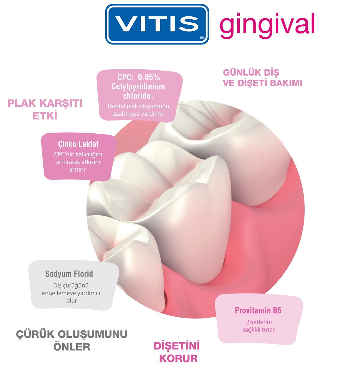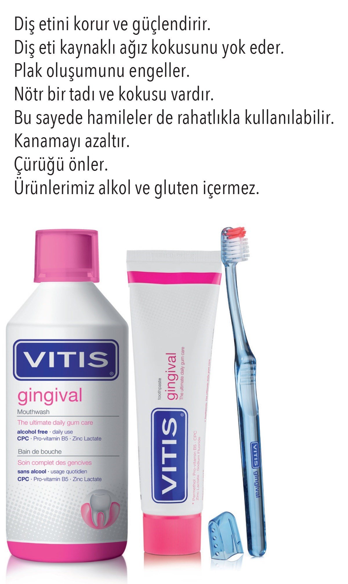 Vitis Gingival üstün içeriği ile günlük diş eti bakımında ağız sağlığının korunmasına yardımcı olur.